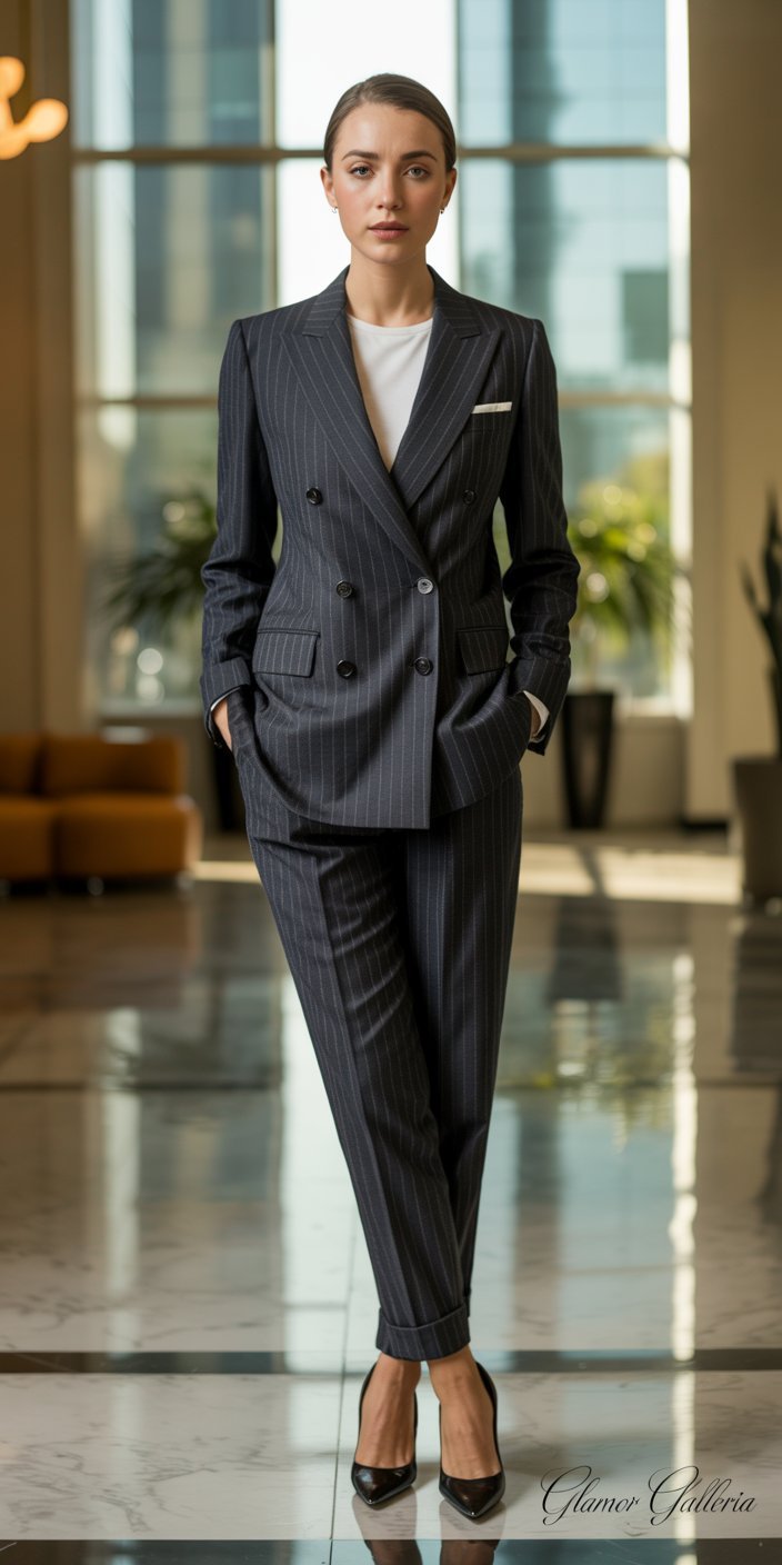 Nothing says “boardroom boss” like a pinstripe, double-breasted suit. In the 1980s, wider pinstripes on charcoal or navy backgrounds established a no-nonsense aesthetic Wikipedia. For 2025, seek out updated cuts—slimmer lapels, shorter jackets, and tapered trousers—while preserving that confident stripe.
