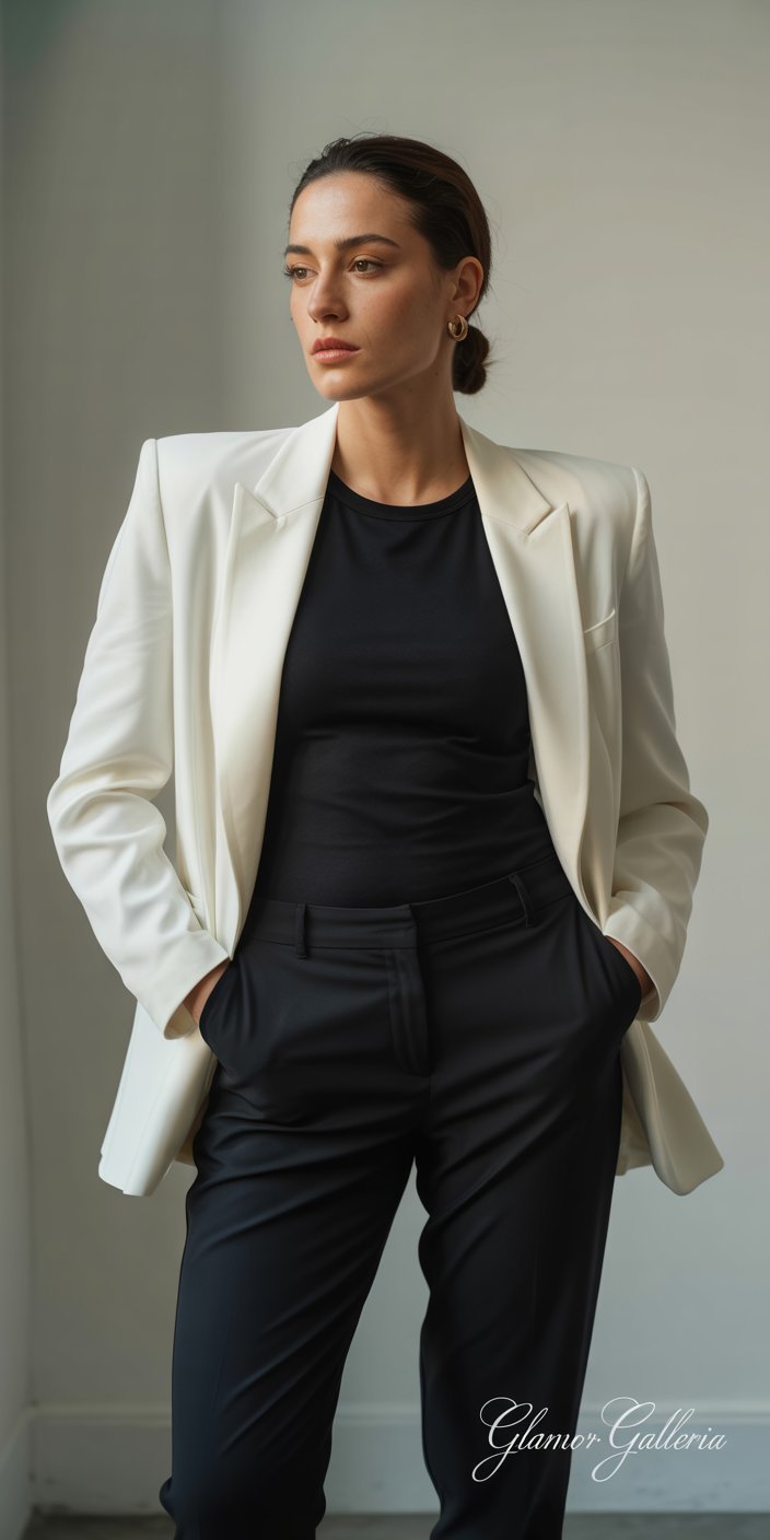 The quintessential ’80s power suit often featured an oversized, boxy blazer. In 2025, cinching that blazer at the waist with a sleek belt adds definition and a nod to high-fashion editorial styling Wikipedia. This approach softens the rigid silhouette while maintaining the authoritative edge.