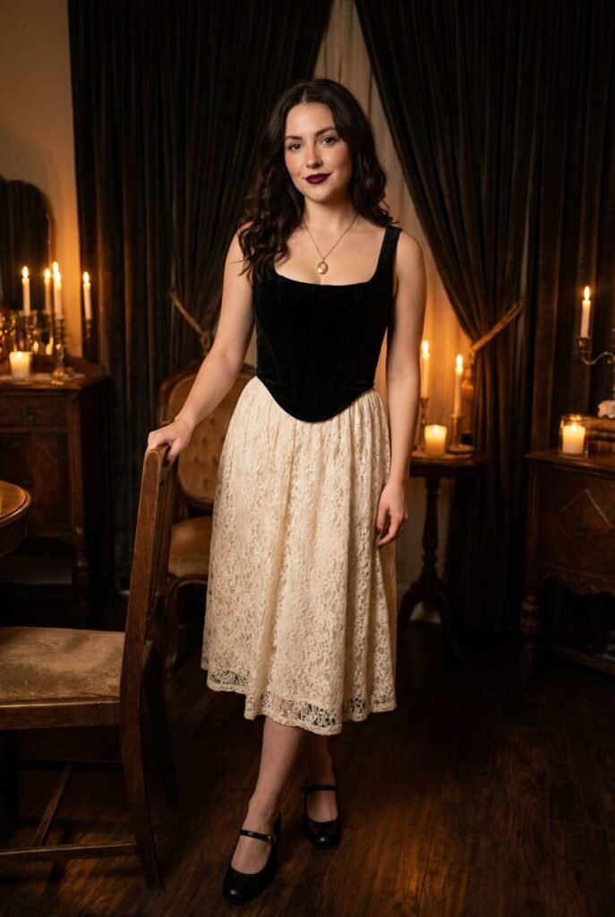 Style it with: Lace midi skirt, Mary Janes, dark lip, vintage locket. Buy at: Etsy (search “dark coquette corset”).