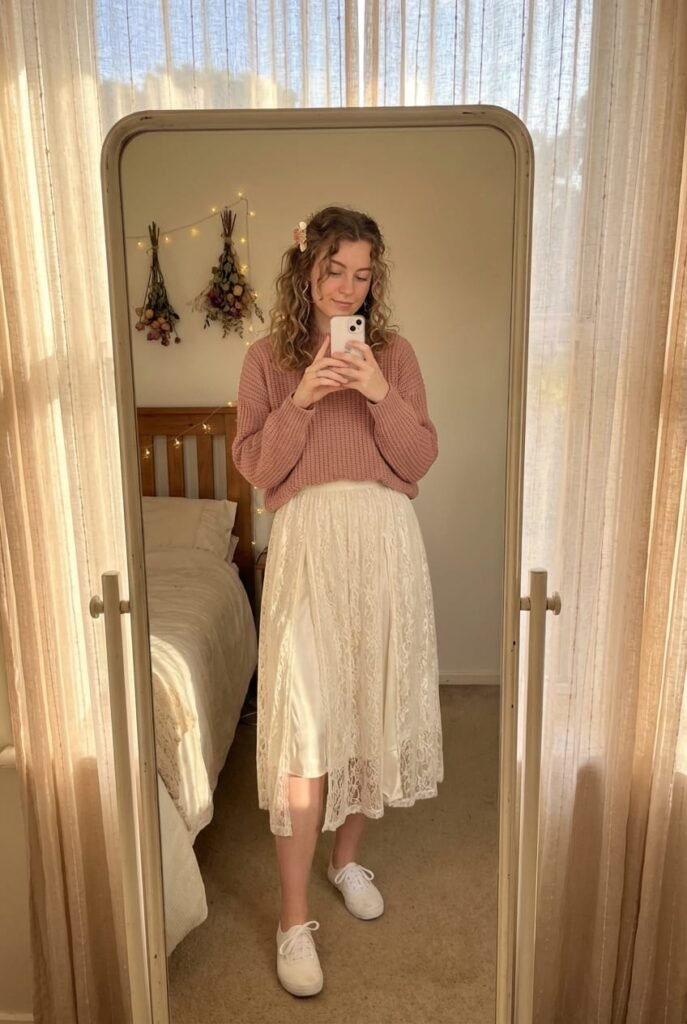 Delicate lace midi skirt in cream or dusty pink. Lace skirts are forecasted to grow 20% in 2026 according to fashion data platform Heuritech. Why it ranks: Best value fairycore piece on the list. Layer over a slip for dreamy texture.
