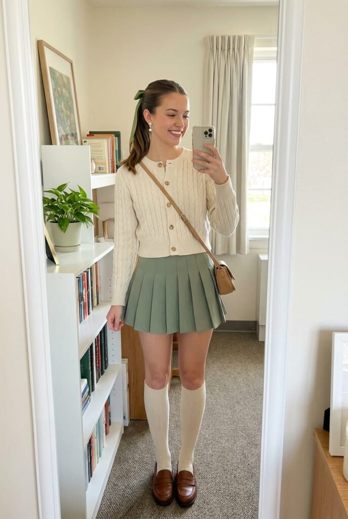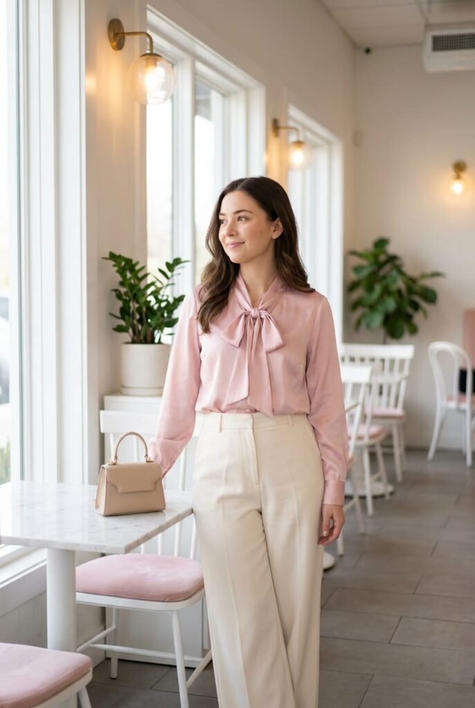 Satin blouse with pussy bow in pastel pink or cream. Bows dominate 2026 runways and Pinterest. Why it ranks: Under $35, machine washable, nails two trending aesthetics at once.