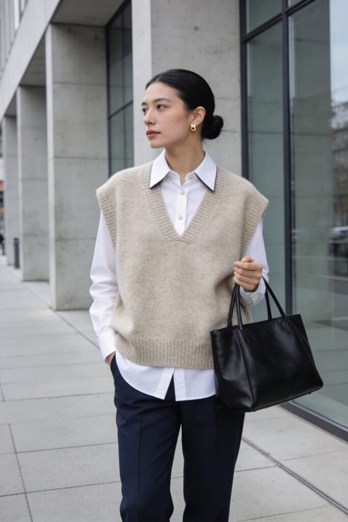 Clean-lined knit vest in oatmeal, black, or sage. COS is the go-to for elevated minimalism. Why it ranks: Works across minimalist, old money, dark academia, and Scandi aesthetics. Premium quality that lasts.
