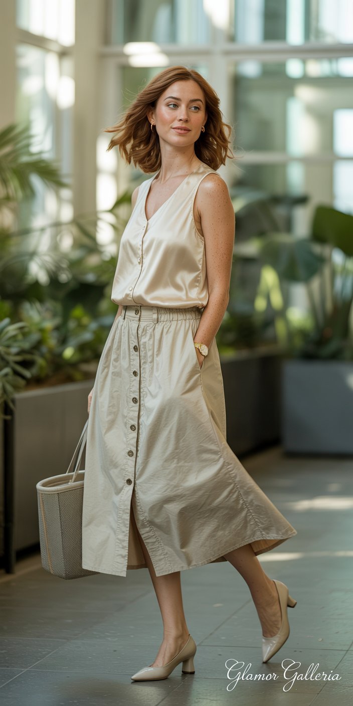 6. Button-Front Midi Skirt + Sleeveless Shell + Comfortable Pumps