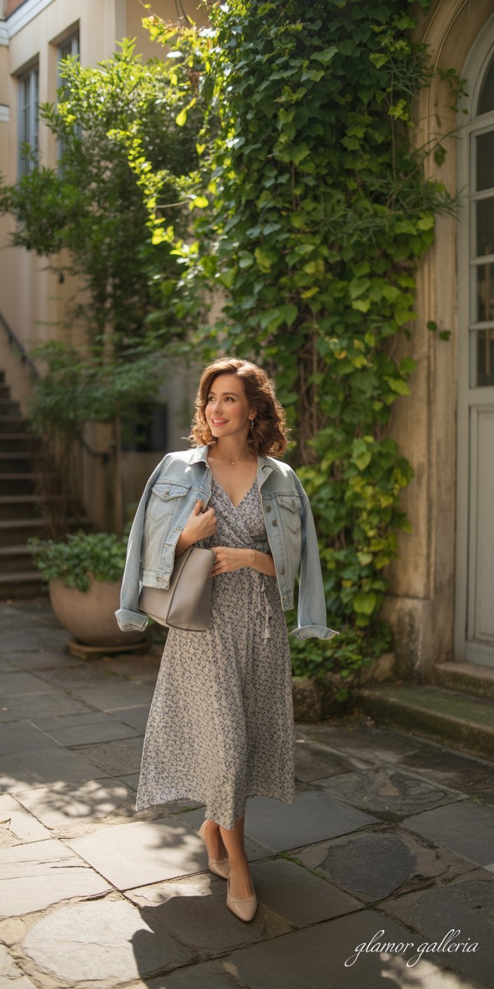 9. Patterned Midi Wrap Dress + Flats + Denim Jacket → Heels + Clutch