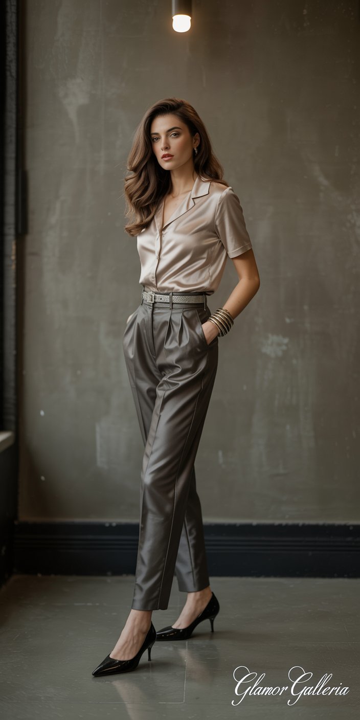 7. Cigarette Pants + Fitted Blouse + Loafers → Heels + Jewelry