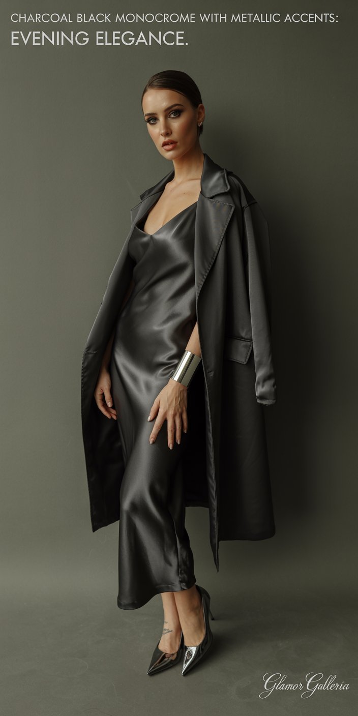 - Key Pieces: Charcoal-black satin slip dress, matching trench coat, and patent leather heels.