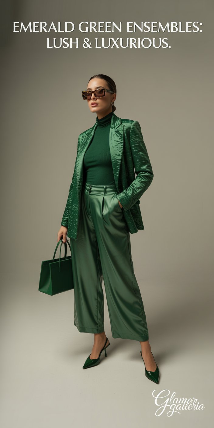- Key Pieces: Emerald-green silk culottes, fitted turtleneck, and pointed-toe slingbacks.