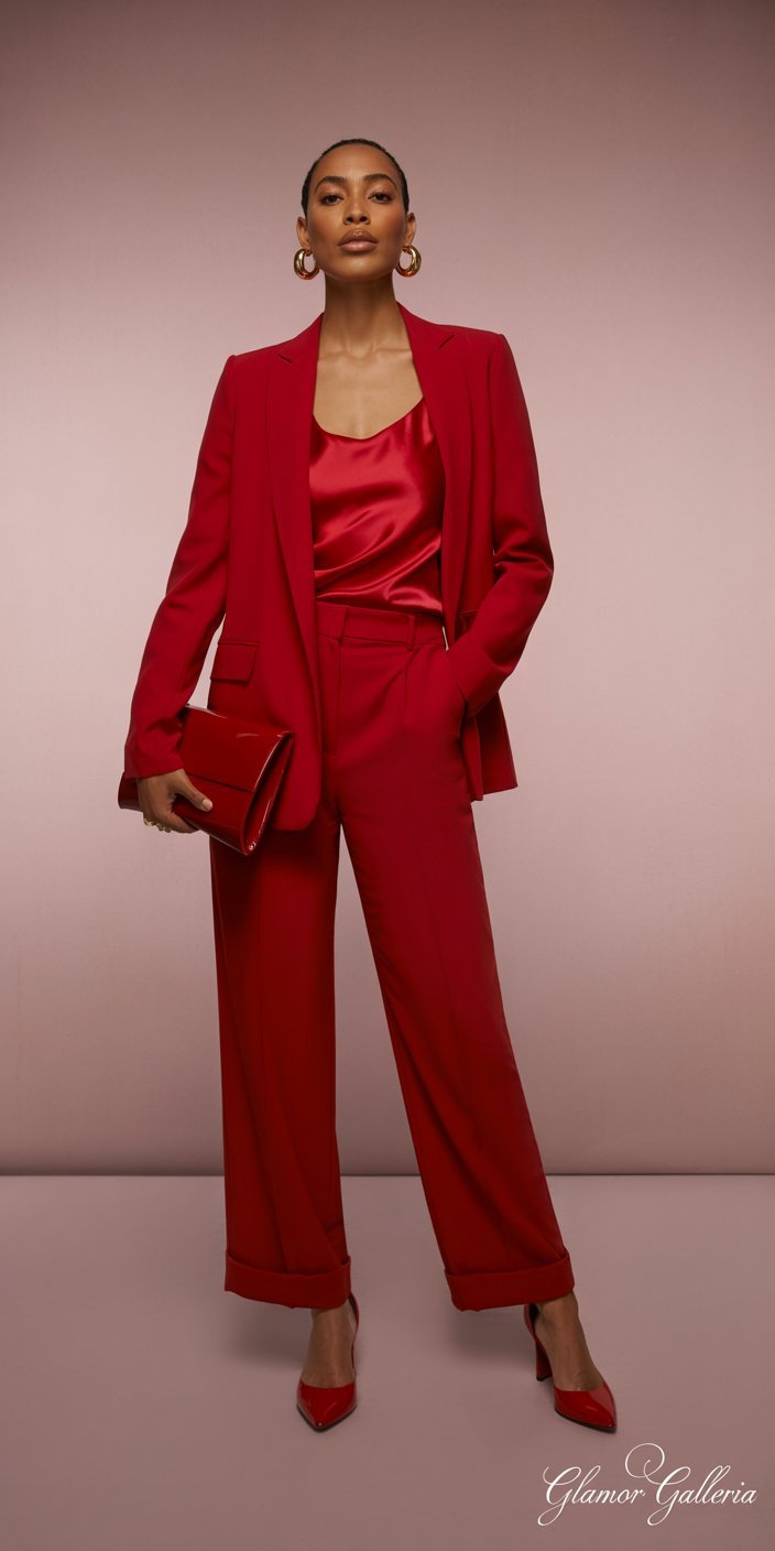 - Key Pieces: A tailored crimson blazer, matching wide-leg trousers, and a silk camisole underneath.