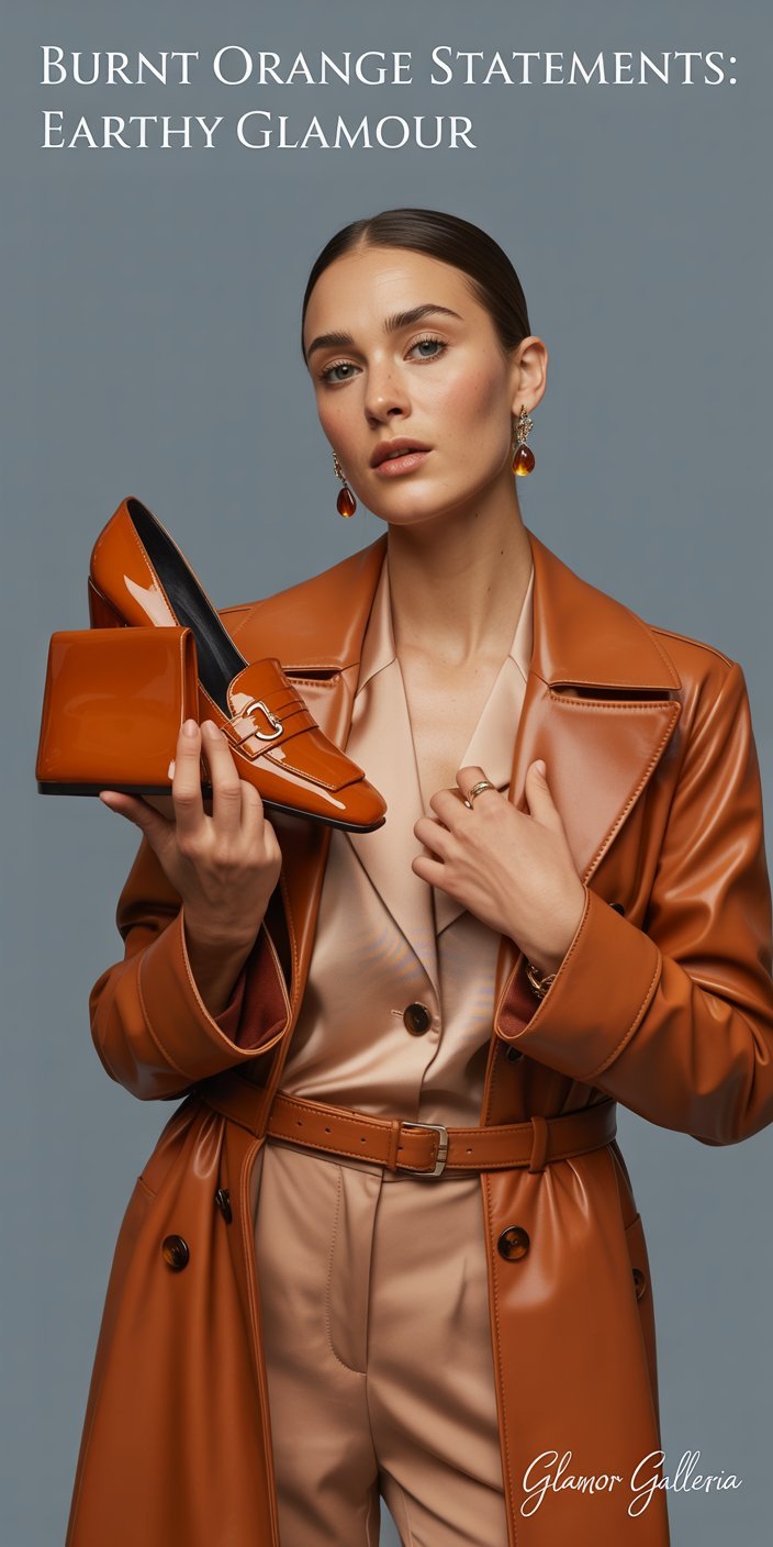 - Key Pieces: Burnt-orange leather trench coat, matching trousers, and patent loafers.