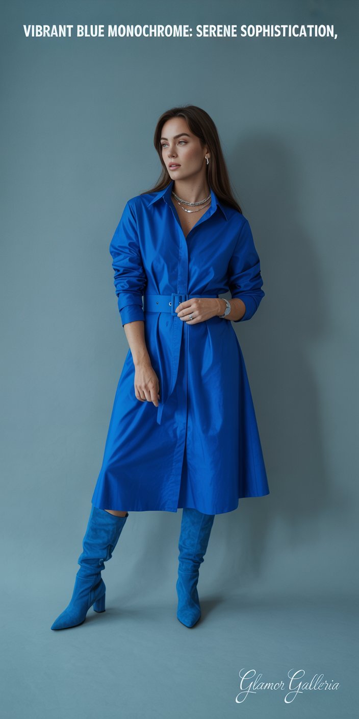 - Key Pieces: A cobalt-blue midi shirt dress, matching belt, and suede knee-high boots.