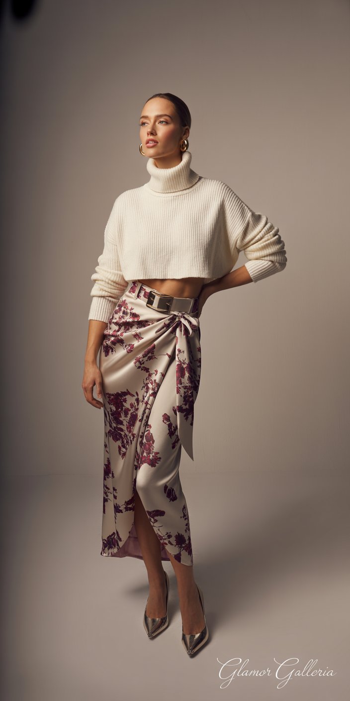 2. Cropped Turtleneck + Floral Silk Wrap Skirt