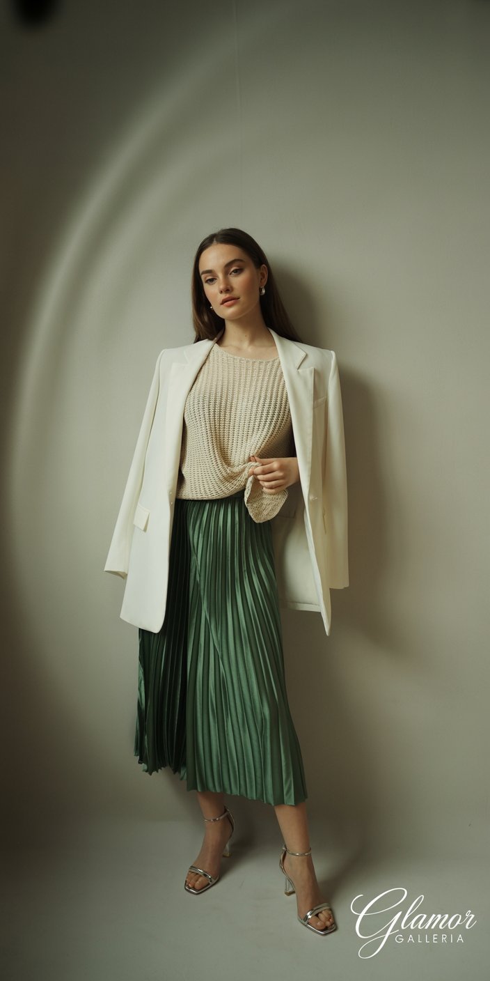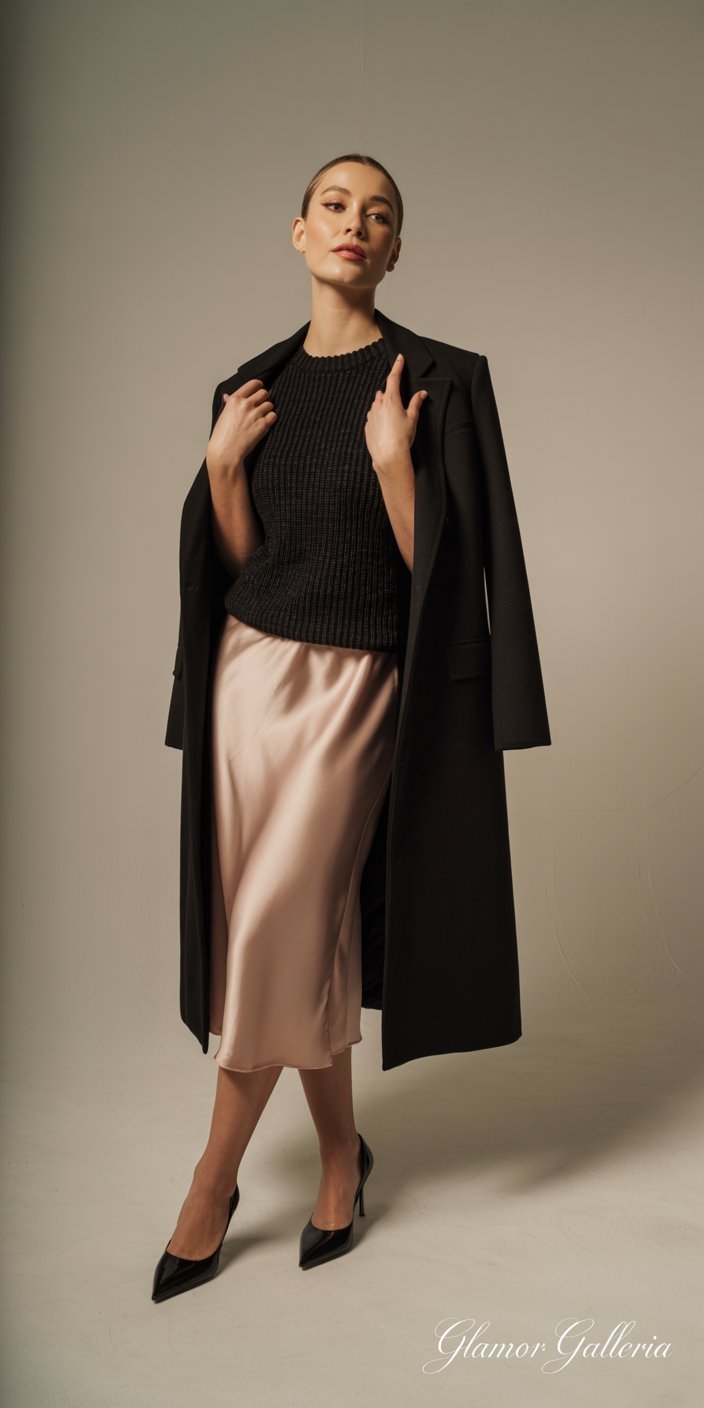 - Silk Midi Skirt: Bias-cut or pleated styles in solids—black, ivory, or jewel tones.