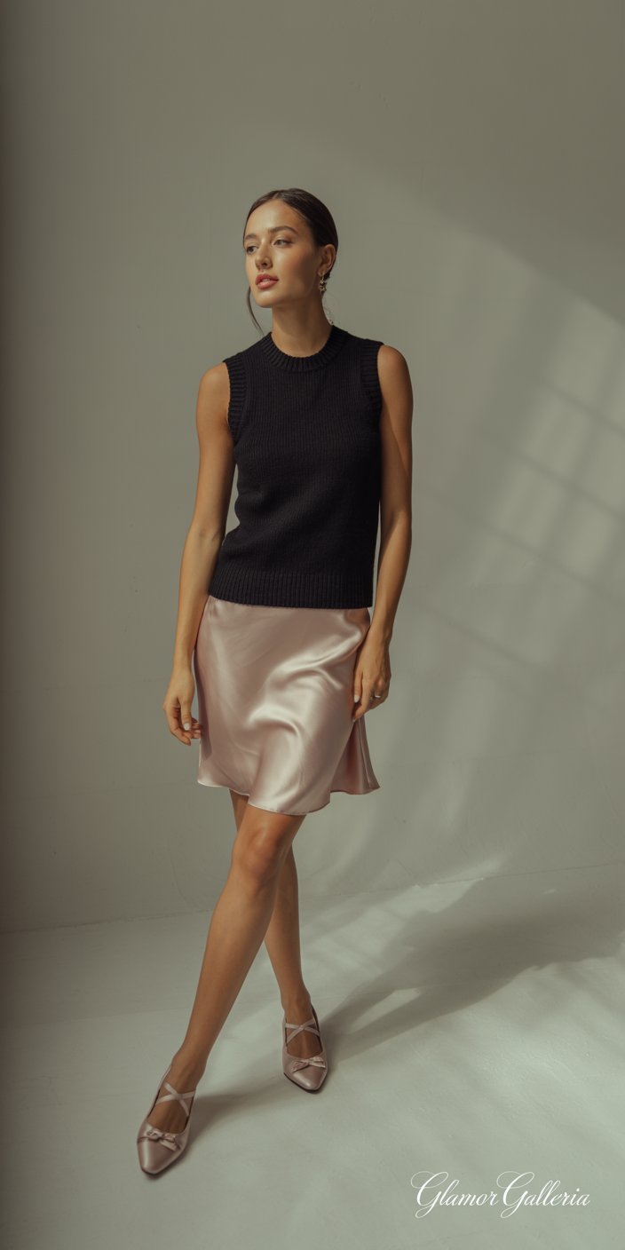 - Day: Layer a black knit vest over a blush-pink silk slip dress, pairing with ballet flats.