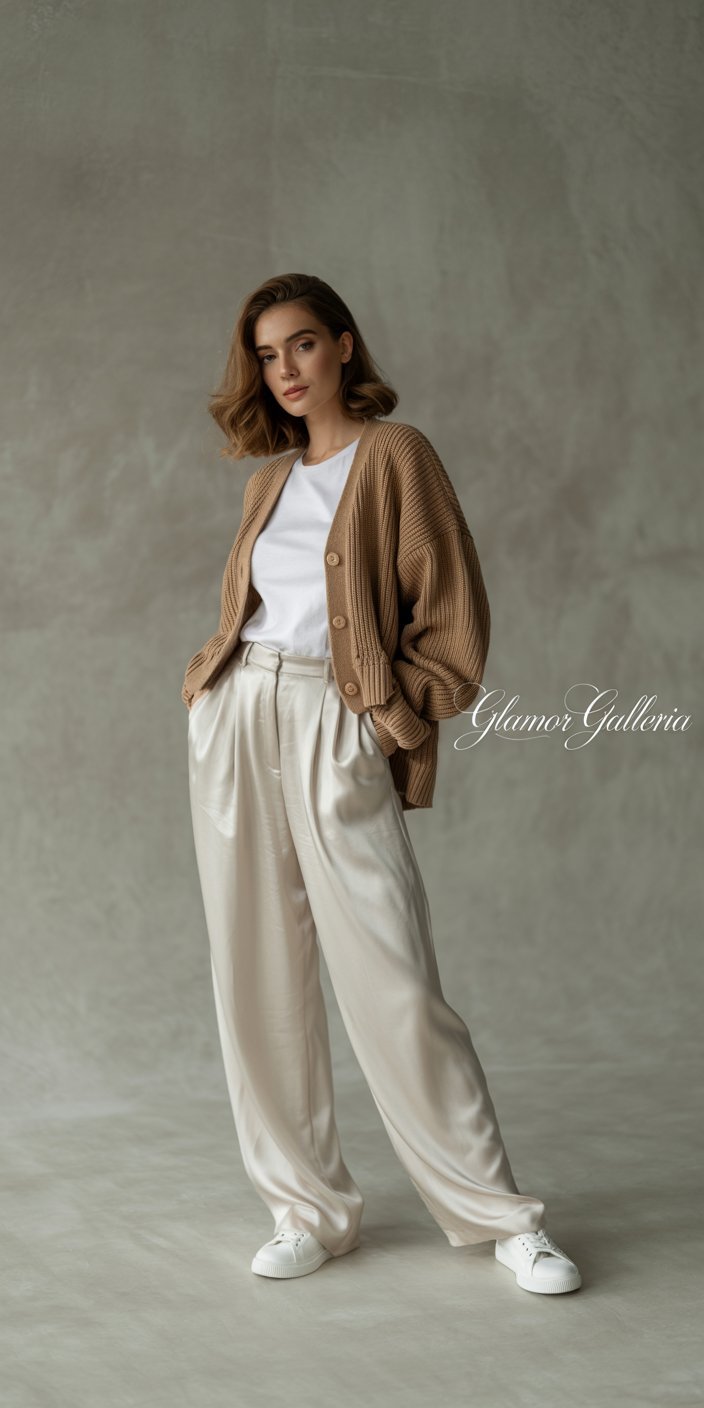 - Day: Wear a camel-colored chunky cardigan buttoned over a tucked-in white tee, teamed with ivory silk wide-leg trousers.