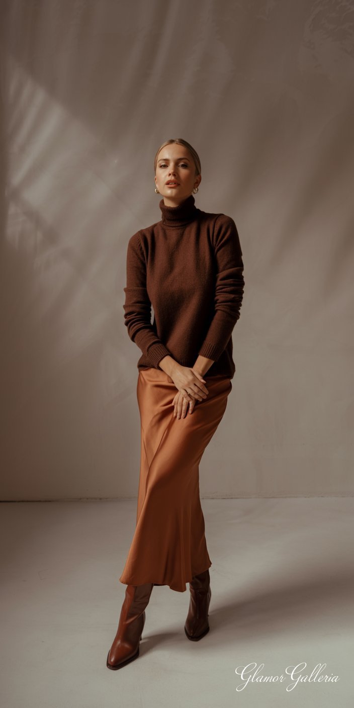 - Day: A chocolate-brown turtleneck tucked into a rust-hued silk slip maxi skirt. Finish with knee-high boots.