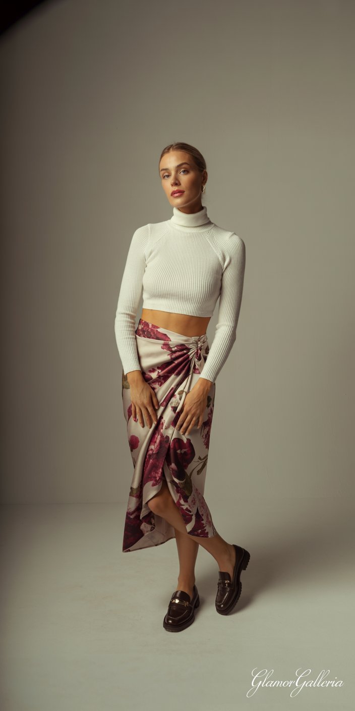 - Day: Pair a cream cropped turtleneck with a printed silk wrap skirt featuring deep berry florals. Finish with loafers.
