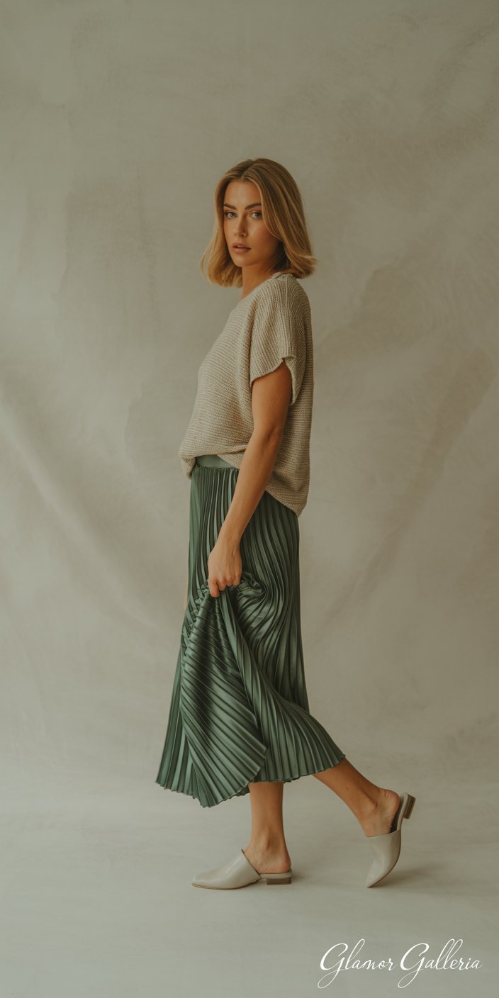 - Day: A slouchy knit tee in oatmeal slotted into a forest-green pleated silk midi skirt. Finish with slip-on mules.