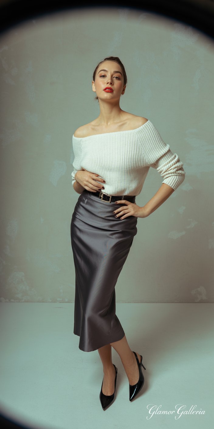 - Day: An off-shoulder ivory knit worn over a high-waist charcoal silk pencil skirt; pair with ankle boots.