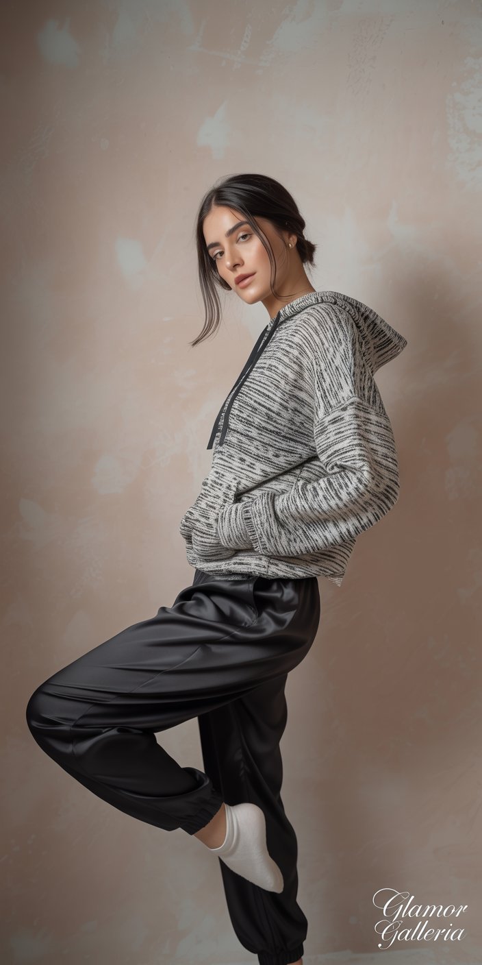 - Day: A heather-grey knit hoodie with black silk joggers for an athleisure-meets-luxe vibe. White dad-style sneakers complete the look.