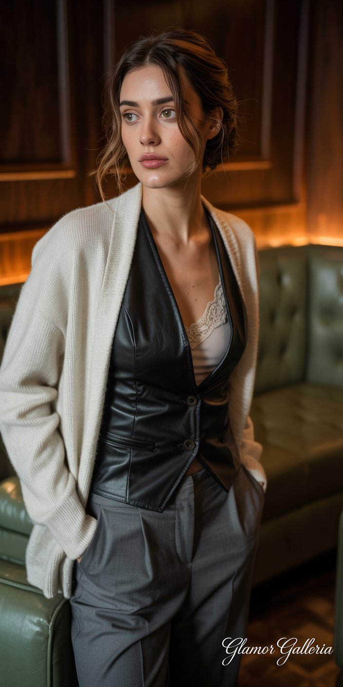 - Day: Monochrome or tonal layers—wool cardigan over cotton shirt.