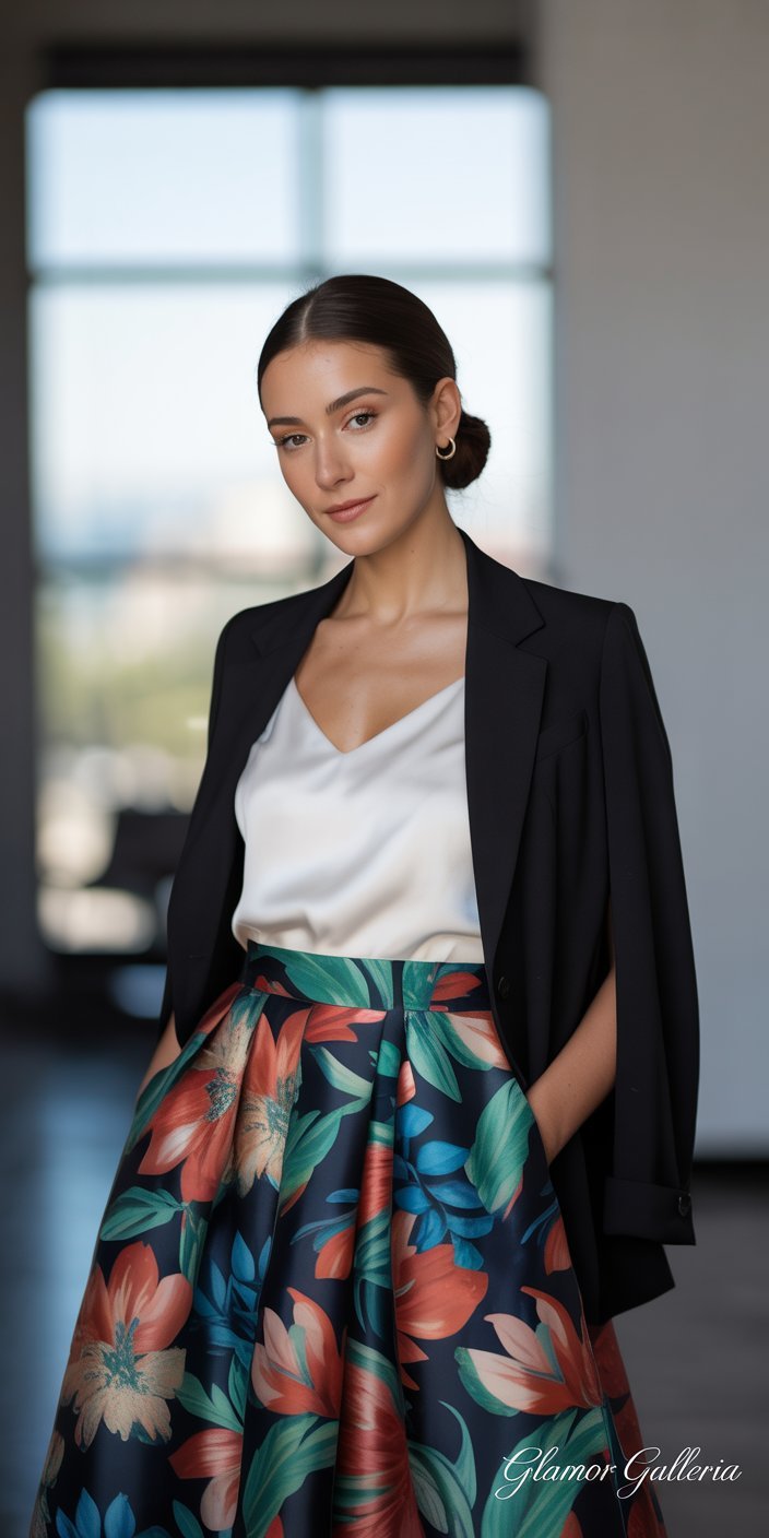 - Keep your statement piece front and center—whether it’s a floral midi skirt or a jewel-tone blazer.