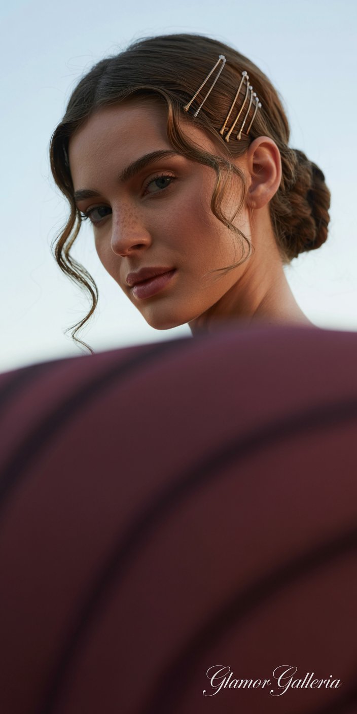 - For updo: gather hair into a low twisted bun, securing with decorative pins or a claw clip.