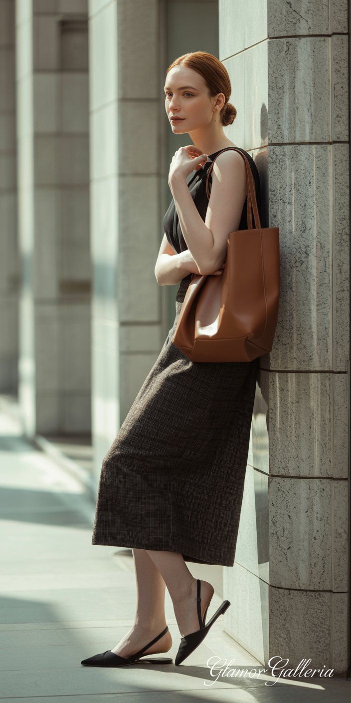 - Adjust hemline if needed—cigaretted trousers or a midi skirt look sharper with heels.