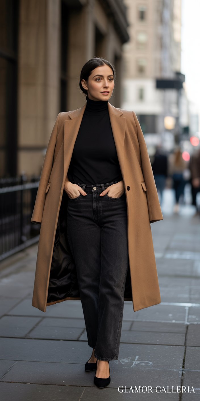• Underneath: Black turtleneck + straight-leg jeans + pointed-toe flats.
