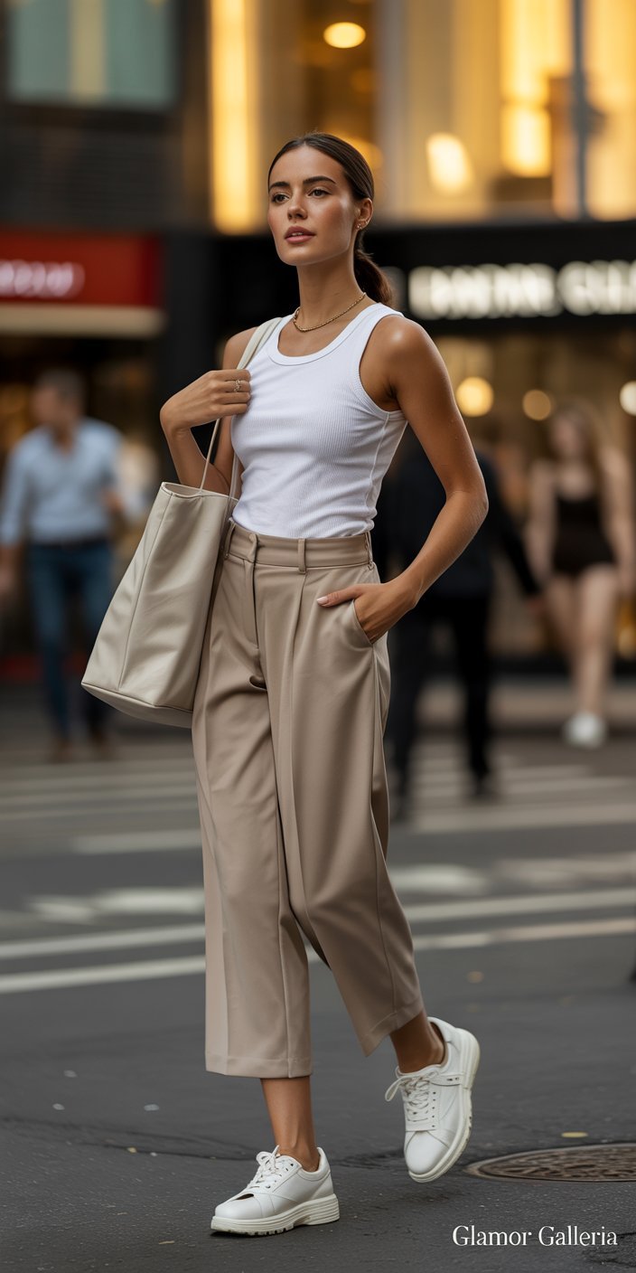 • Day: White tank + tailored beige culottes + white sneakers + oversized tote.