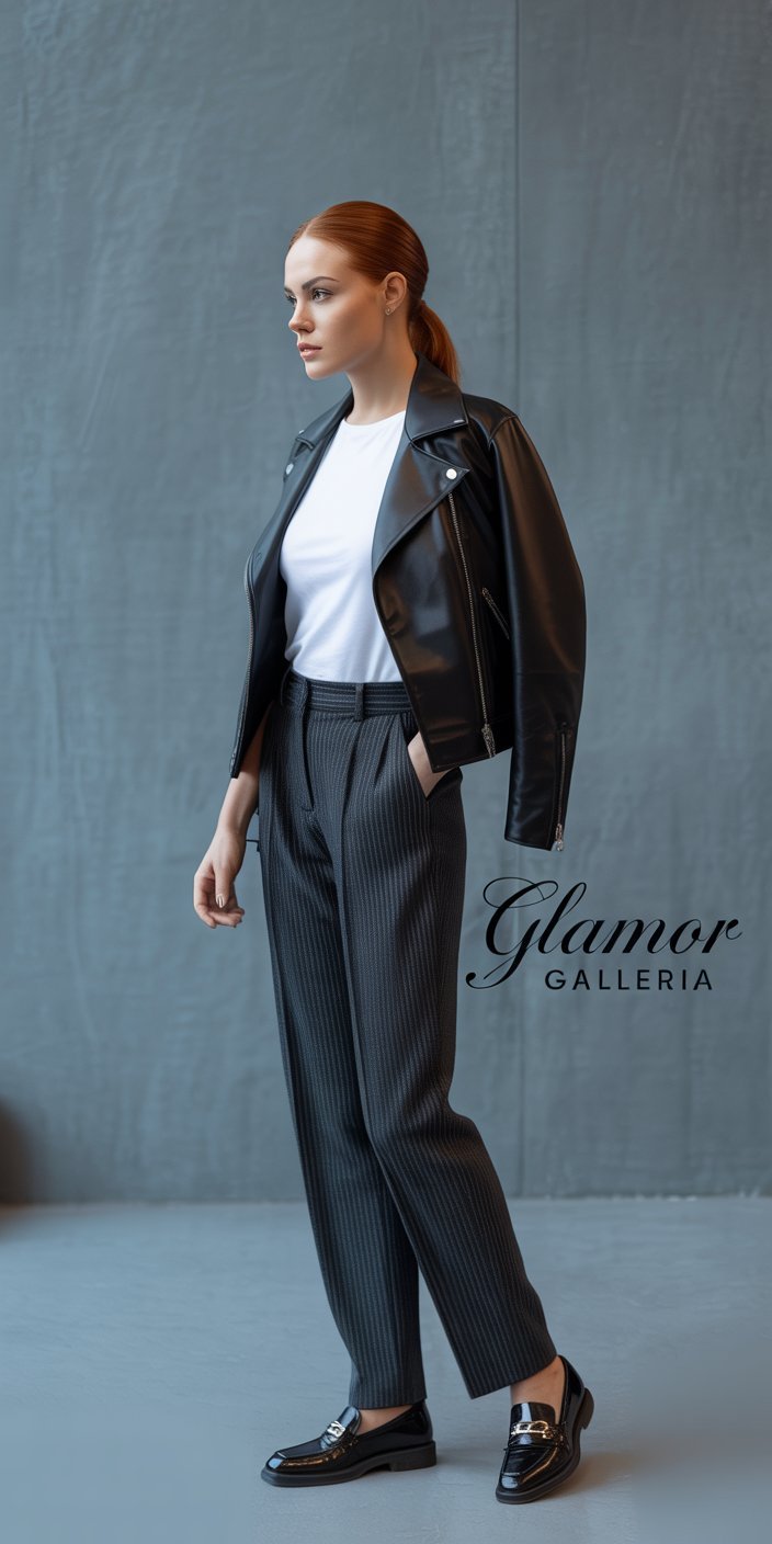 • Styling Example: Pinstripe trousers + white tee + black moto jacket + loafers.