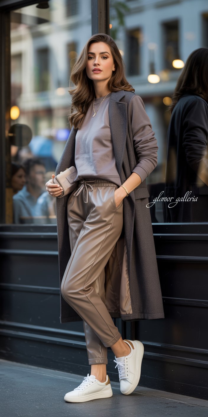 • Core Pieces: Tailored joggers, a luxe sweatshirt, and leather sneakers.