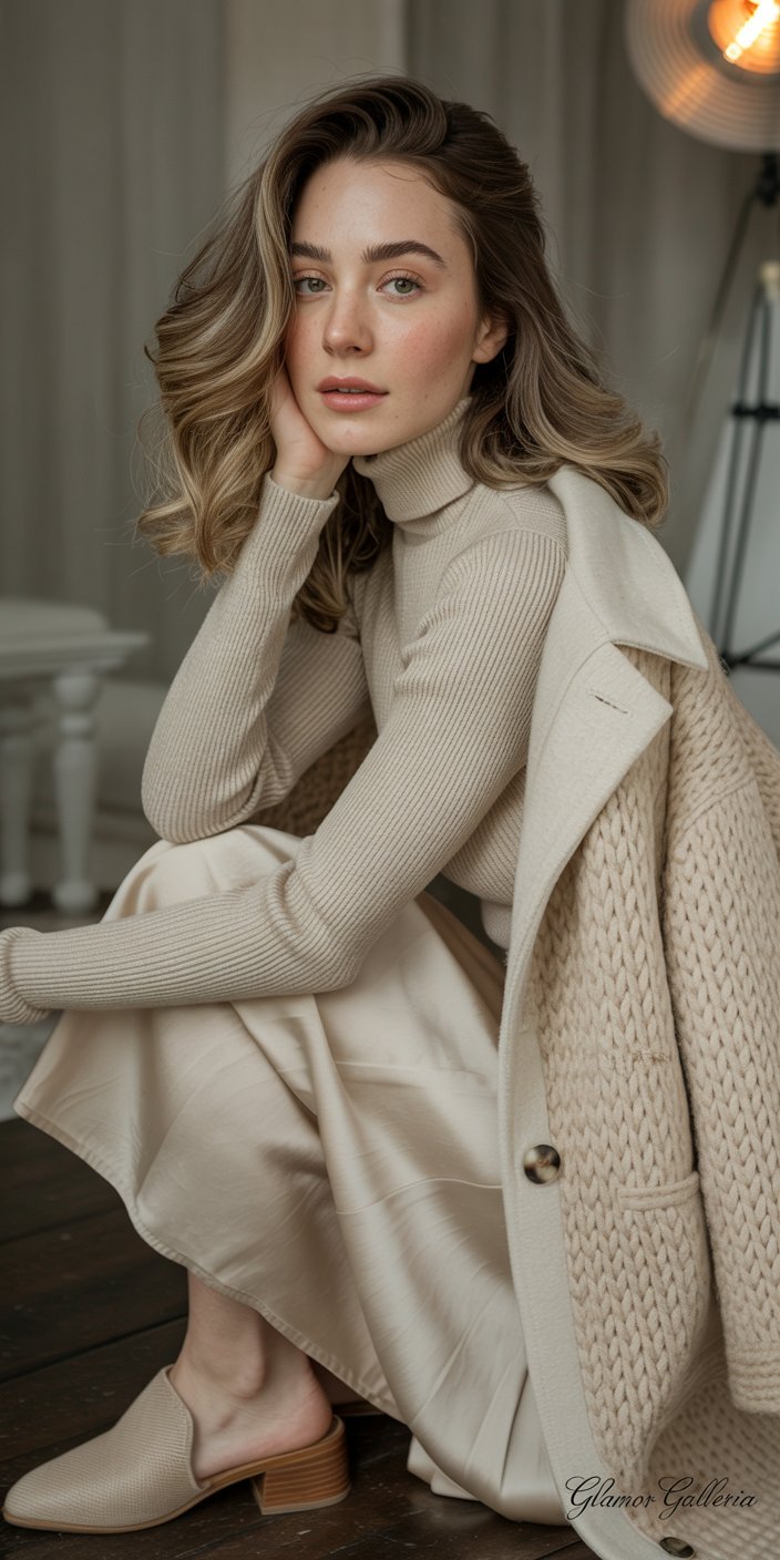 • Outfit Formula: Silk slip skirt + ribbed turtleneck + open-weave wool cardigan + suede mules.