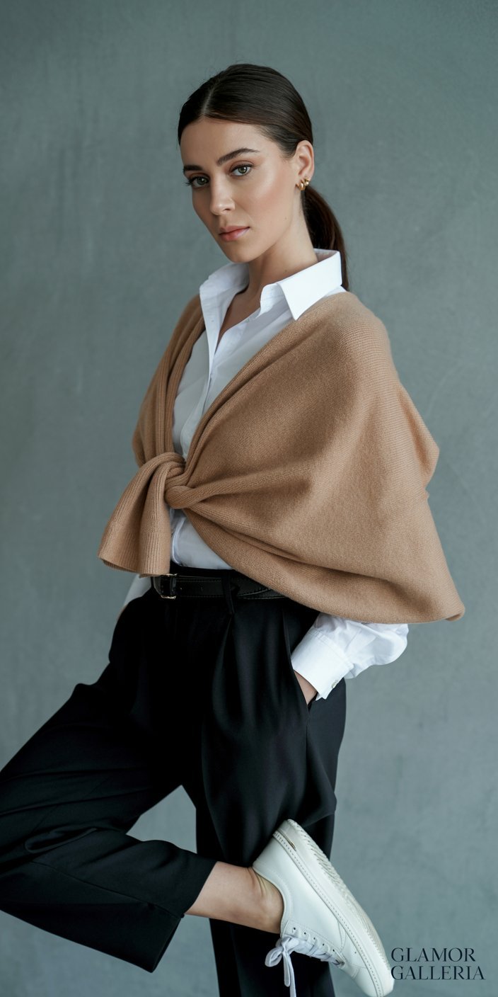 • Key Pieces: A white button-down shirt, a fine-gauge cashmere sweater, tailored black trousers, and crisp white sneakers.