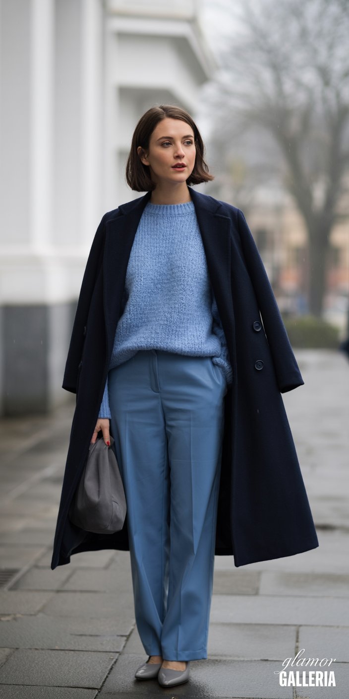 • Combine: Sweater + pants + coat in progressively darker or lighter tones of that hue.