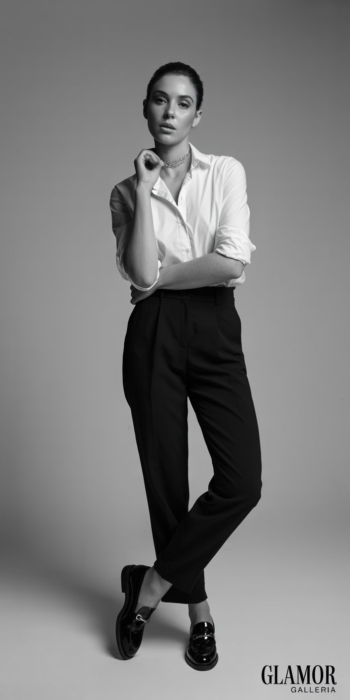 • Formula: White button-up + black high-waist skirt or trousers + minimalist loafers.