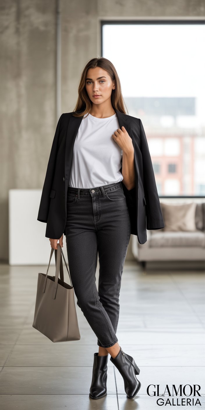 • Assembly: Mix any two or three items for instant cohesion. Example: Crewneck tee + jeans + blazer + ankle boots.