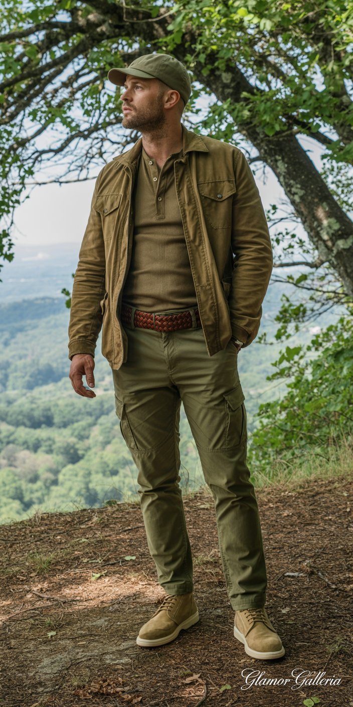 - Base: Olive cargo pants + olive henley or tee