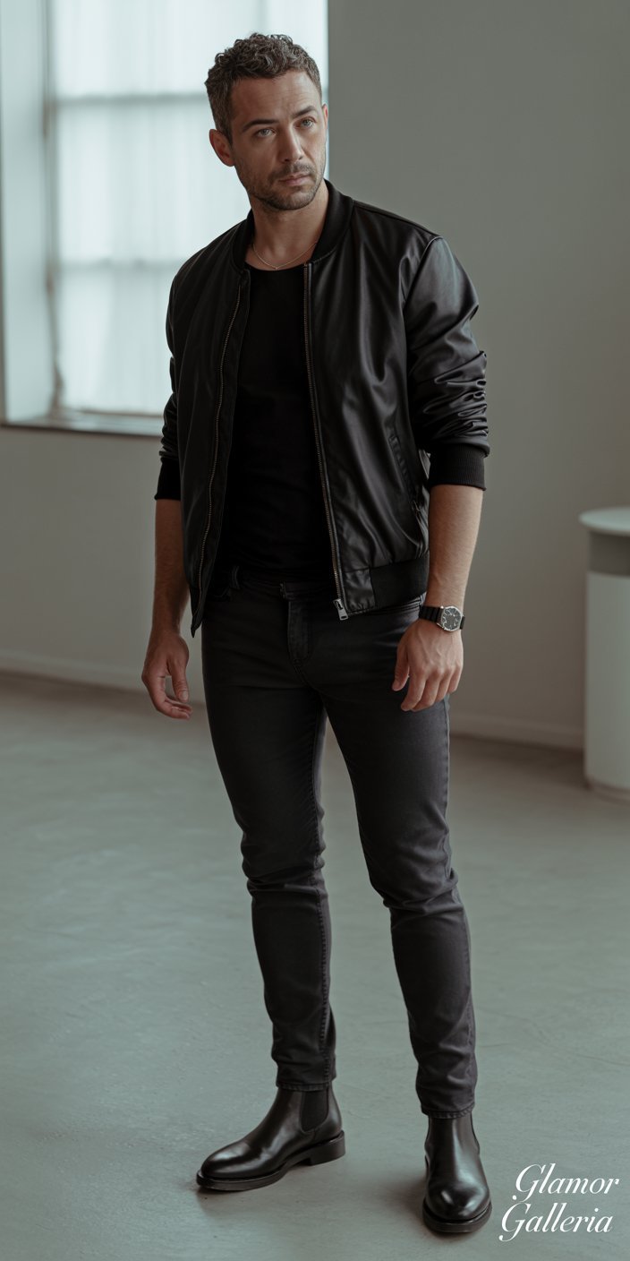 - Layer: Black leather bomber or tailored blazer