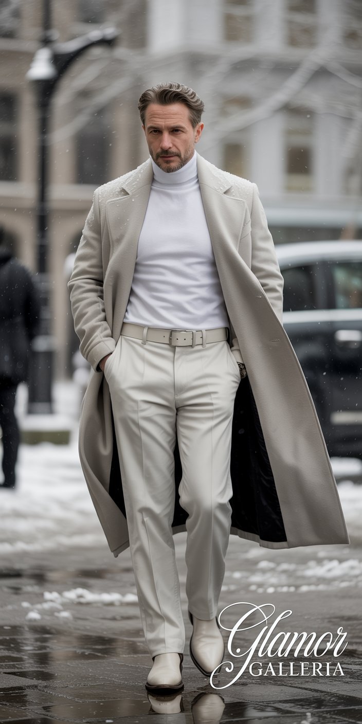 - Base: White turtleneck + white wool trousers