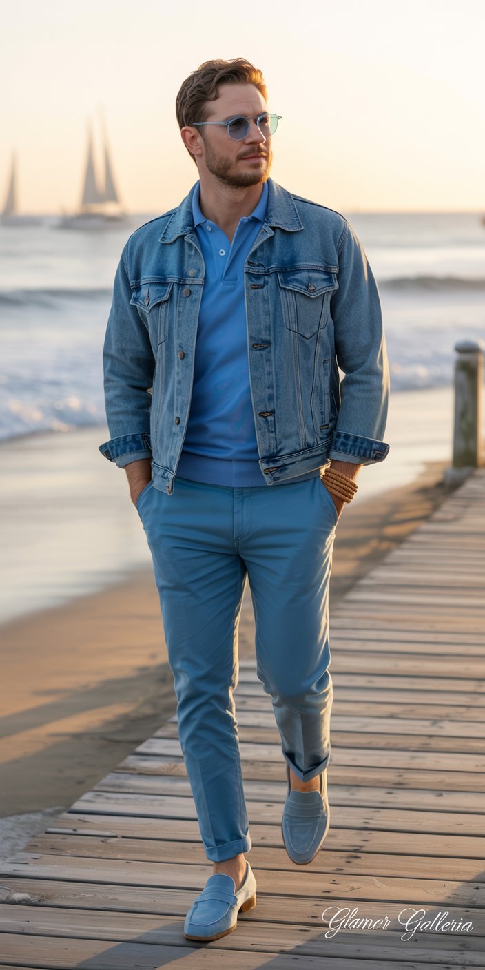 - Shoes: Light blue suede loafers or white sneakers with blue accents