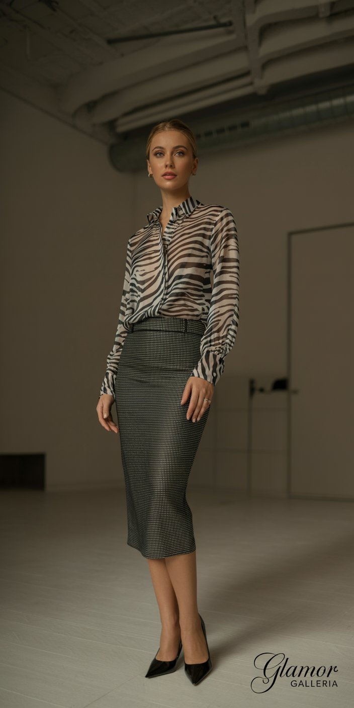 - Example: Wear a graphic zebra-print blouse under a subtle micro-dot pencil skirt; the blouse takes center stage.