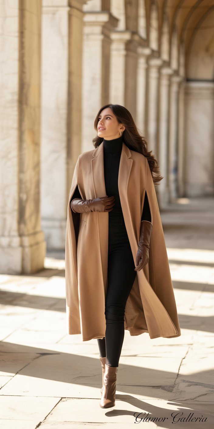 - Skinny Bottoms: Slim trousers or leggings make the full cape silhouette sing.