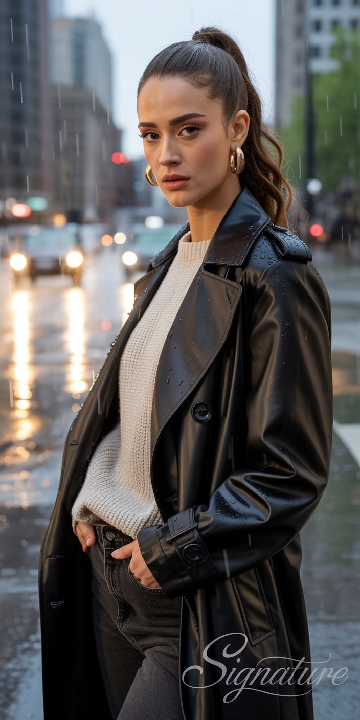 - Editorial Edge: A leather trench or moto-inspired wrap coat signals bold confidence.