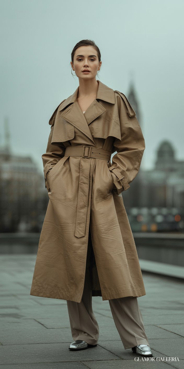 - Modern Heritage: A classic trench cut in exaggerated proportions—camp collars, epaulets, and dropped shoulders update the archetype.