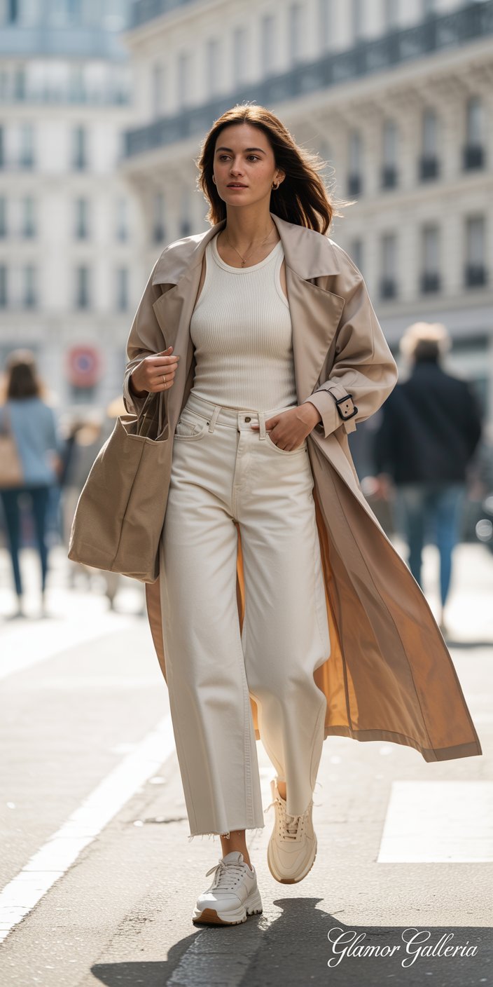 Let volume do the talking: belt the trench loosely so it billows, and half-tuck the tank for shape. A latte-tone canvas tote adds a rougher texture within the palette.