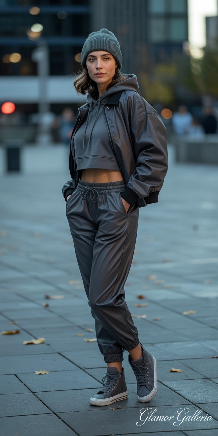 Mix performance fabric with faux leather for a luxe/sport tension. Scrunch socks over the jogger cuffs and layer thin silver chains to break up the gray scale.