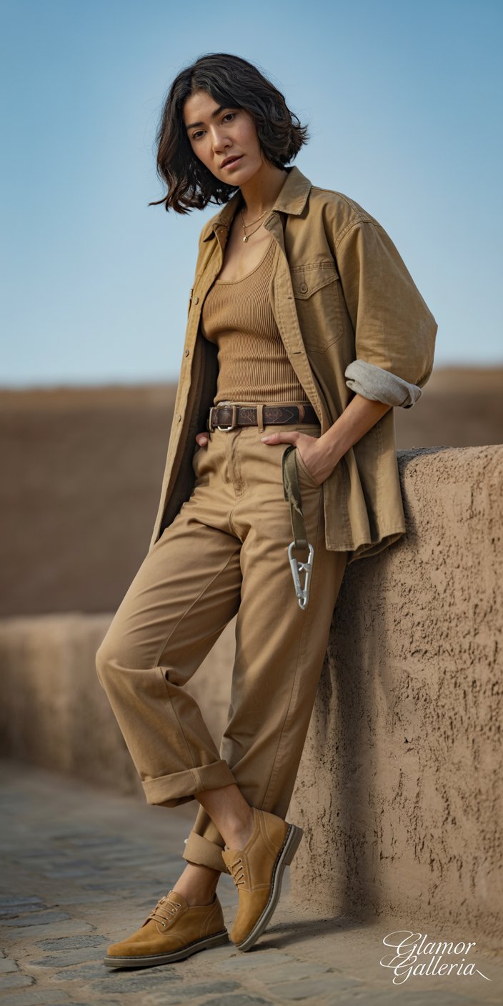 Fasten one cargo pocket, leave the other unbuttoned for movement. Add stackable wooden bangles to echo the earthy vibe without straying from neutral territory.