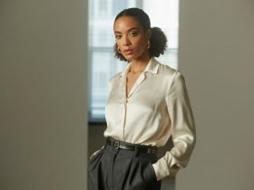 Keep hardware dark: gunmetal buttons, muted eyelets. Pop the shacket collar and tuck only the front panel for effortless attitude.