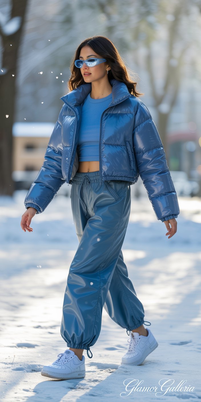 Activate the bungee cords so pants balloon above sneakers. Add translucent blue sunnies for Y2K edge without color diversion.