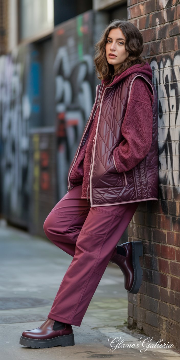 Layer the vest over the hoodie for a skater-meets-utility profile. Glossy boots play off the matte fleece—opposites that fit because the hue is shared.